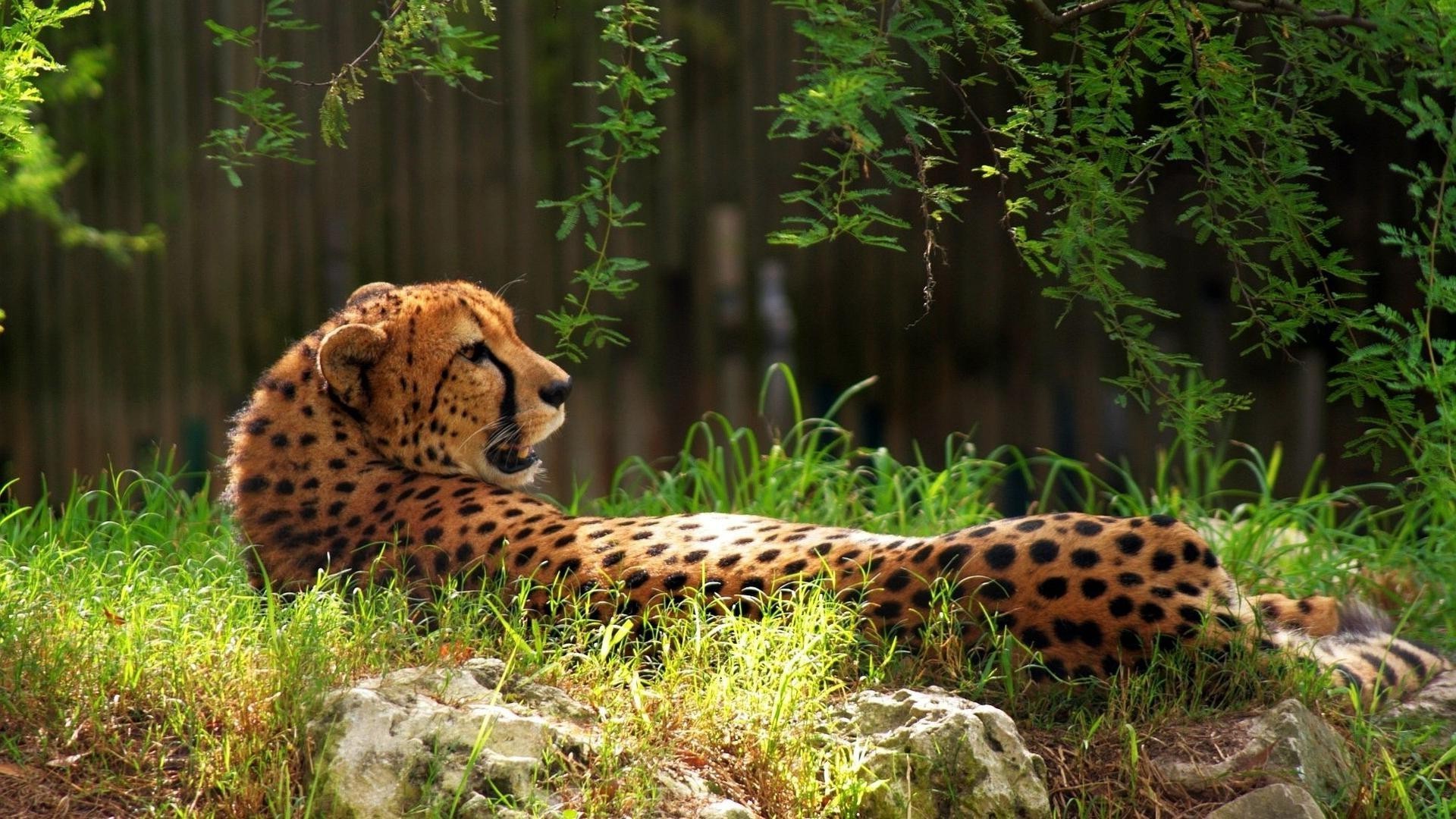El guepardo se encuentra en la habitación contra el fondo del bosque - fondos de Escritorio