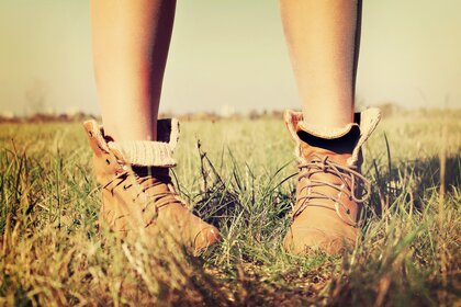Pies en zapatos en la hierba en verano