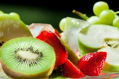 Primer plano de kiwi, manzana y fresa