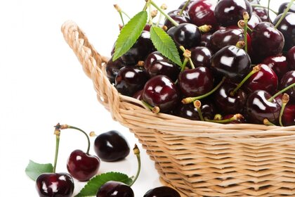 Cesta de cerezas maduras con una hoja