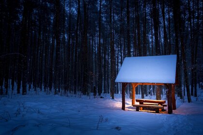 Un mirador solitario iluminado en un bosque oscuro de invierno