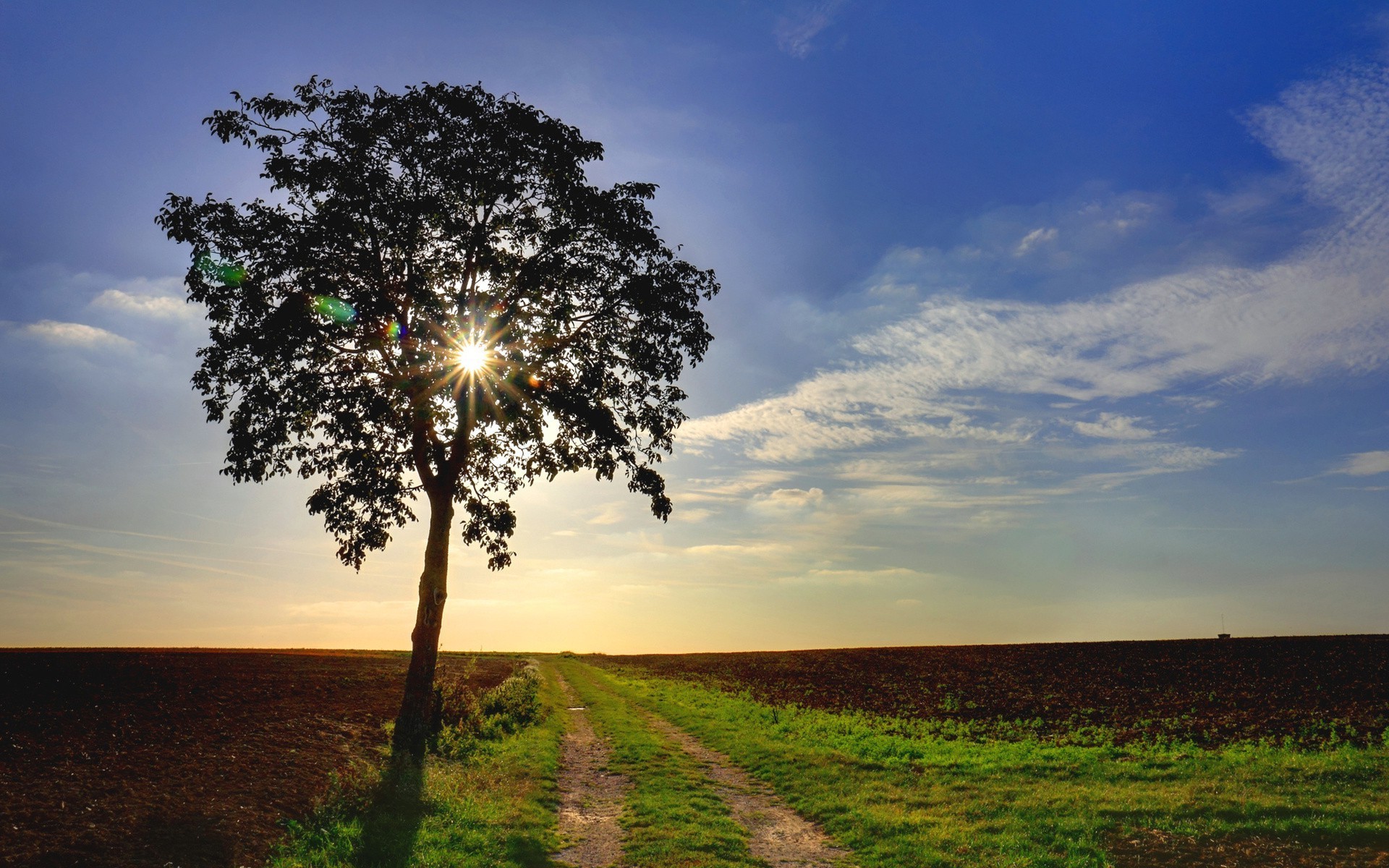 Un árbol solitario en el campo como si envolviera el sol - fondos de Escritorio