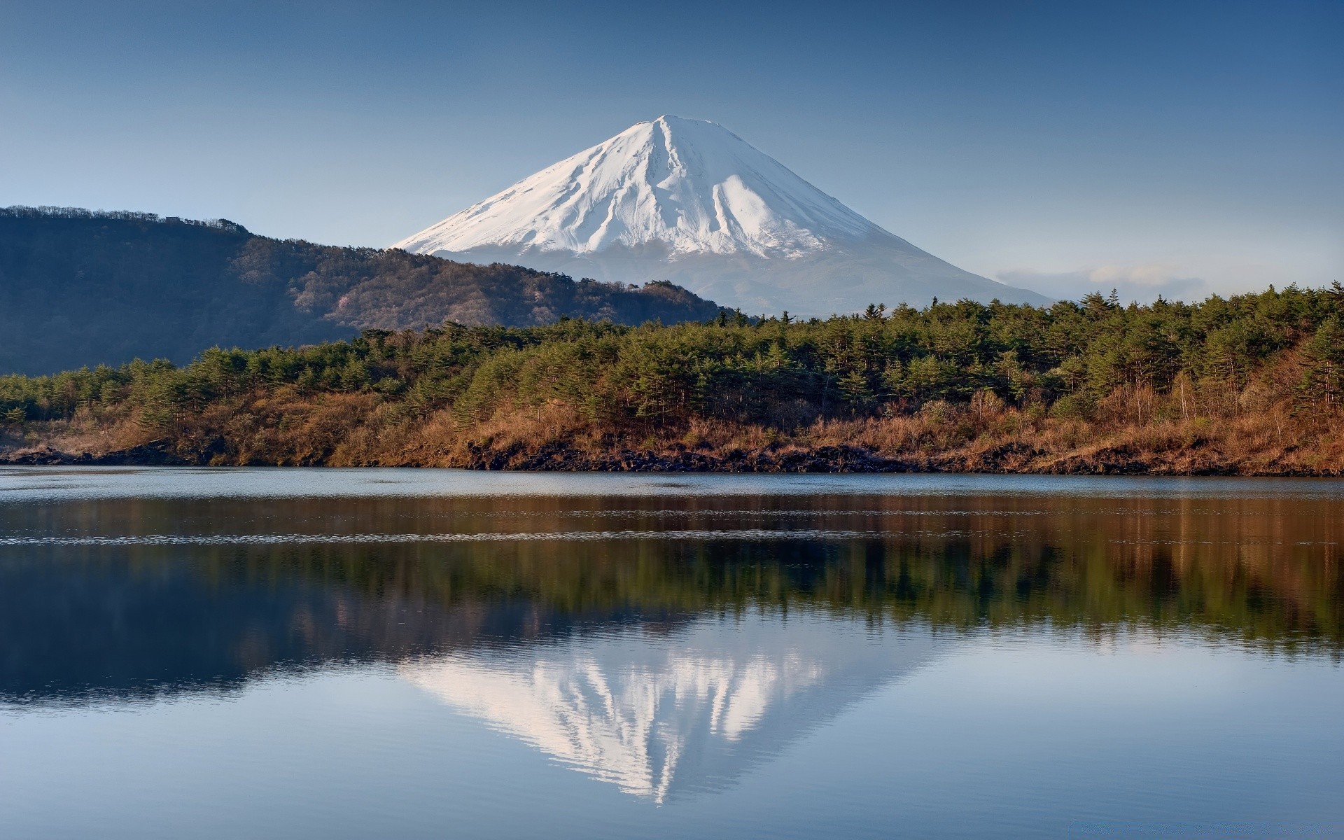 Fujiyama. hermosa cima nevada de la montaña. reflejo de la montaña en el aguaFujiyama. Hermosa cima Nevada de la montaña. Reflejo de la montaña en el agua