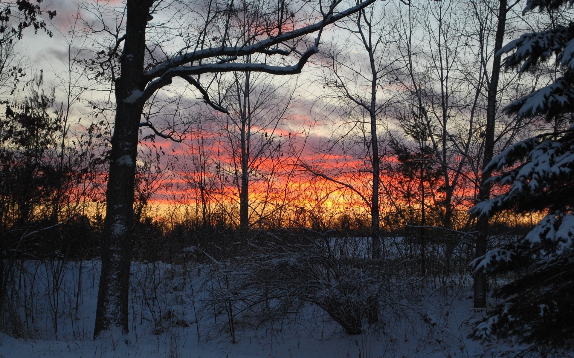 Amanecer en el bosque frío de invierno