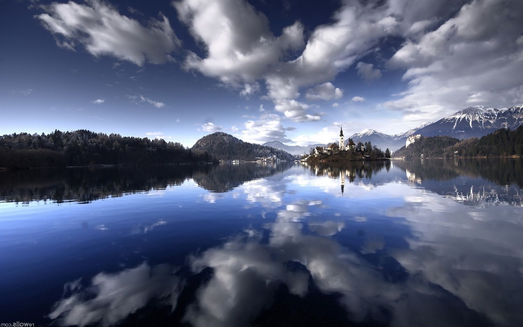 Amanecer en medio de montañas cubiertas de nieve y bosques