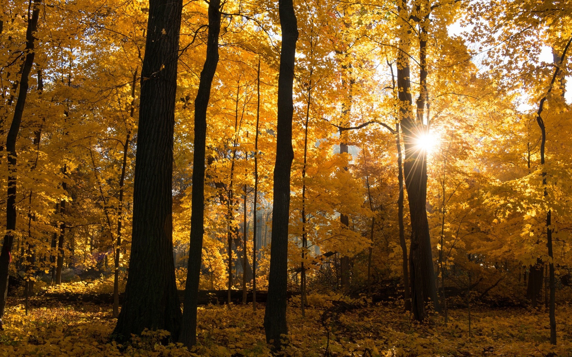 Amanecer de otoño a través de los árboles