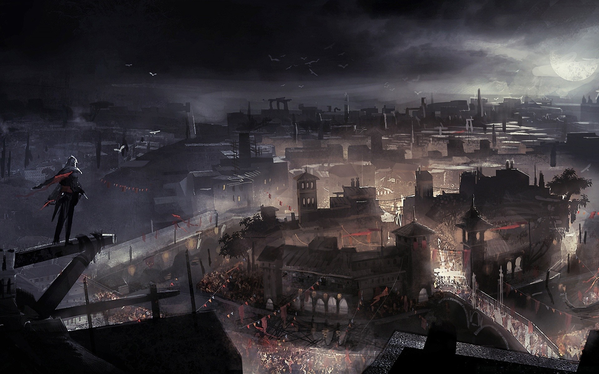 El personaje principal del juego assassin's creed en la capucha de perfil