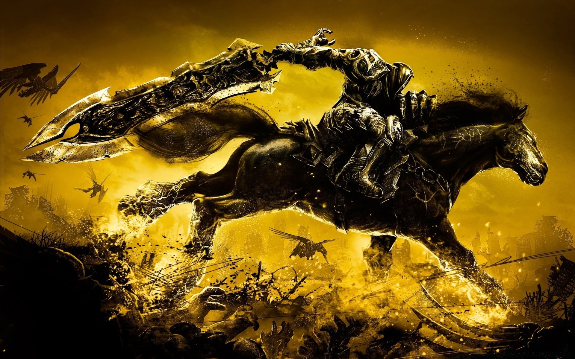 Caballero a caballo en el estilo de la fantasía en la escala de oroCaballero a caballo en el estilo de la fantasía en la escala de oro