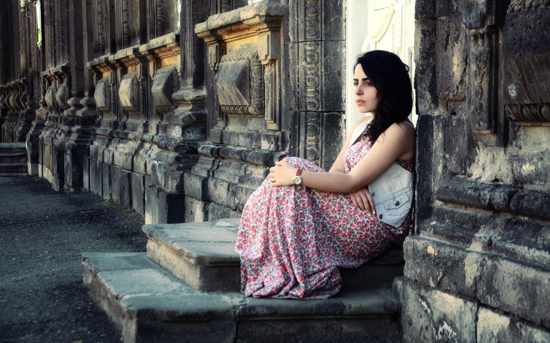 Mujer con vestido rojo yace sobre una piedra