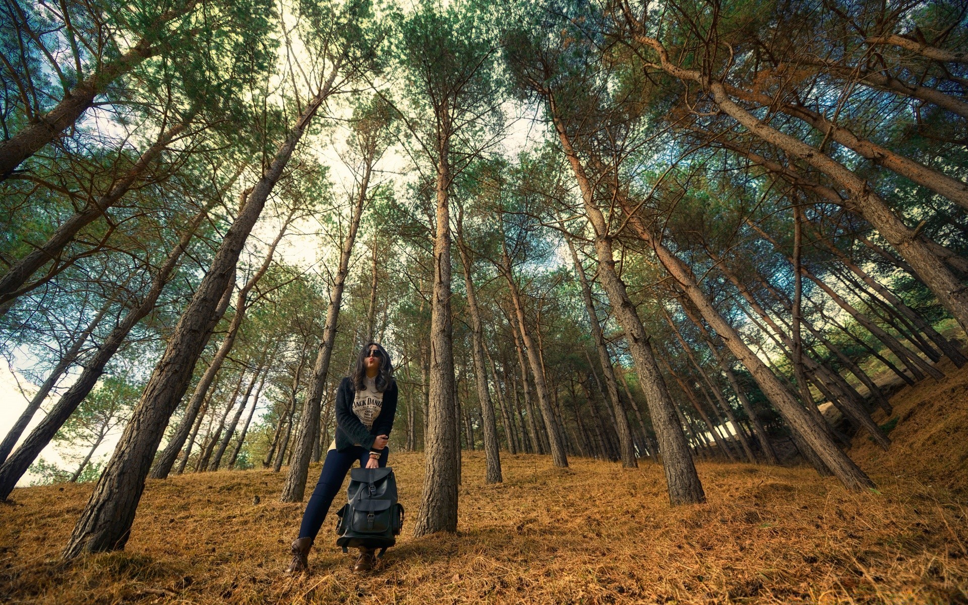 Chica viajera en el fondo del bosque