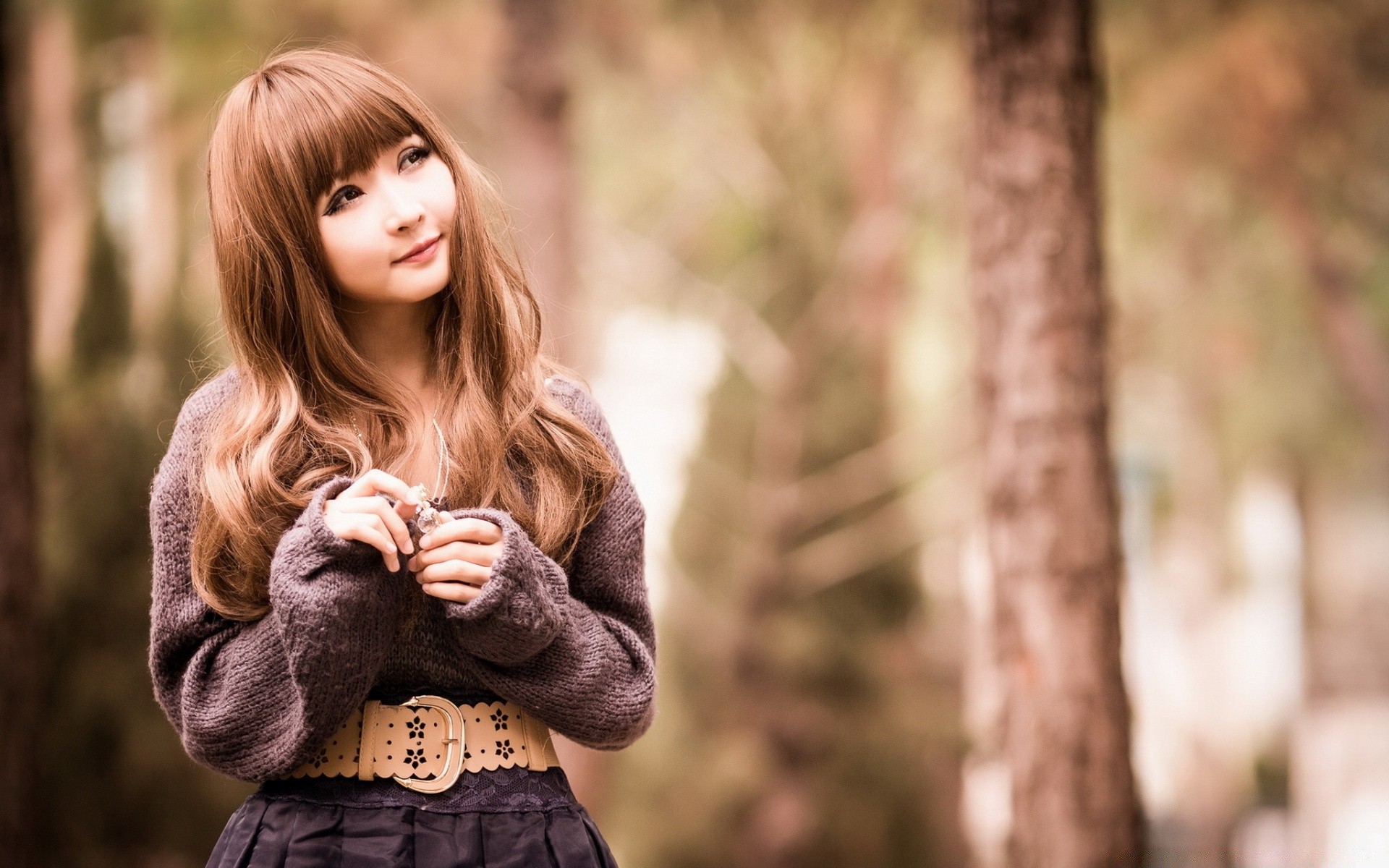 Chica Oriental con el pelo largo en el fondo borroso de los árboles