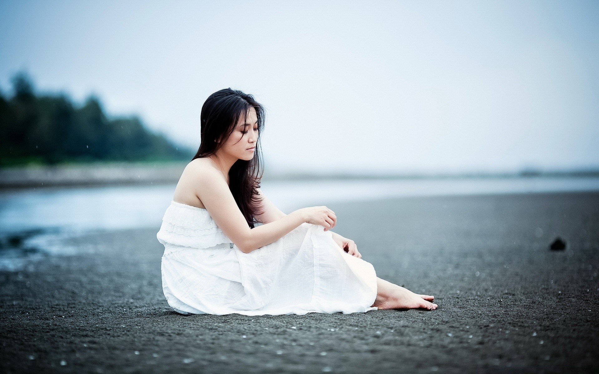 Chica en vestido blanco en la playa