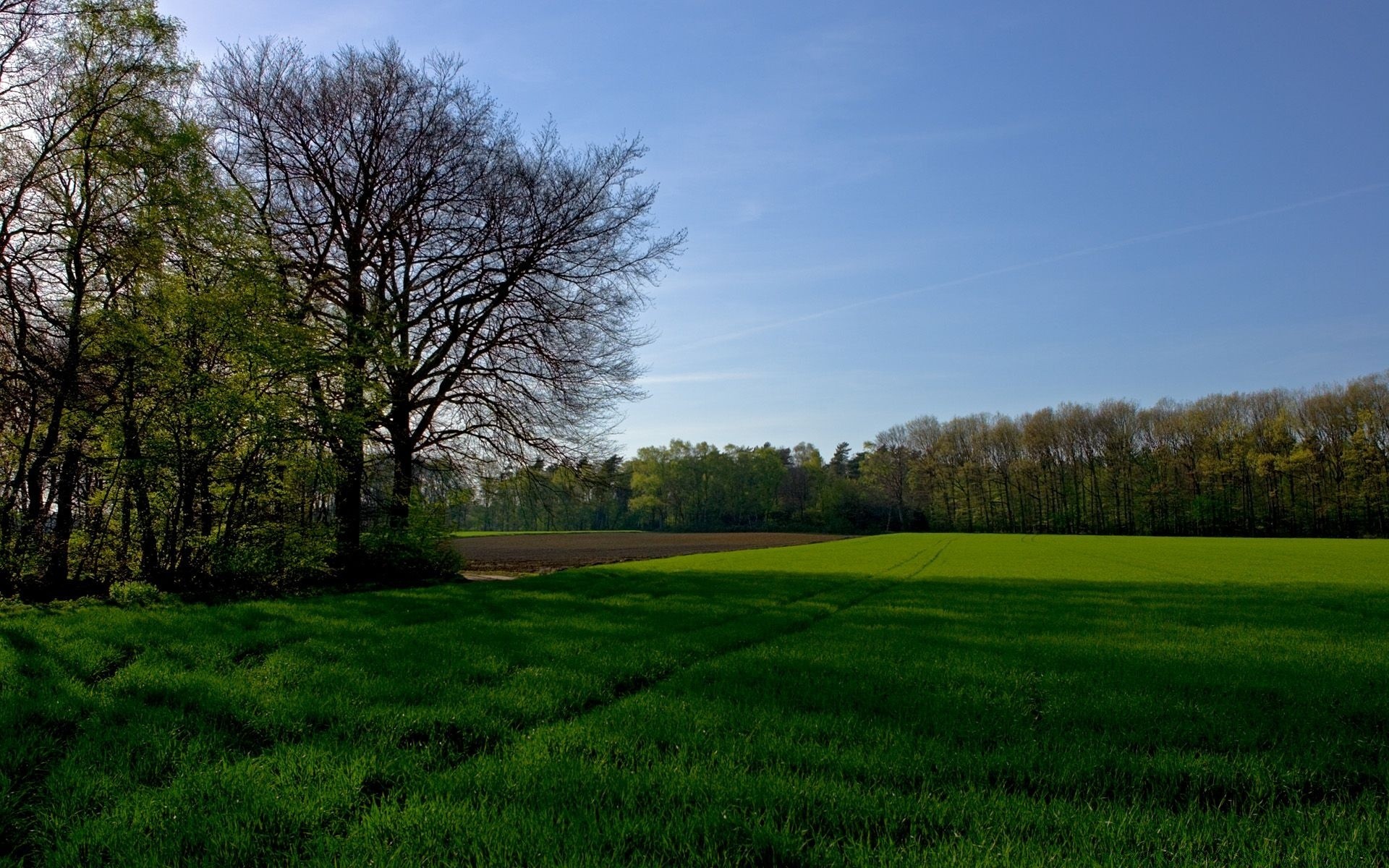 Naturaleza, campo, hierba jugosa rodeada de bosques