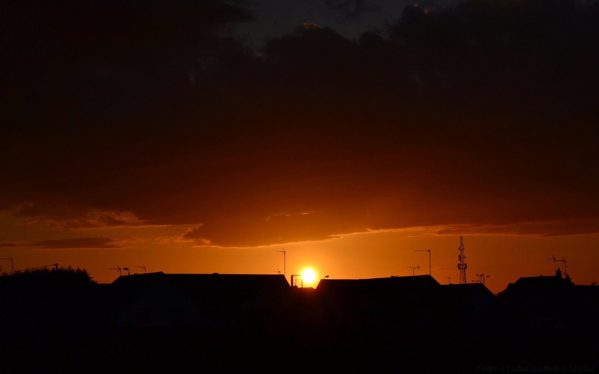 La puesta de sol se esconde detrás de los techos oscuros de las casas en un brillante cielo naranja