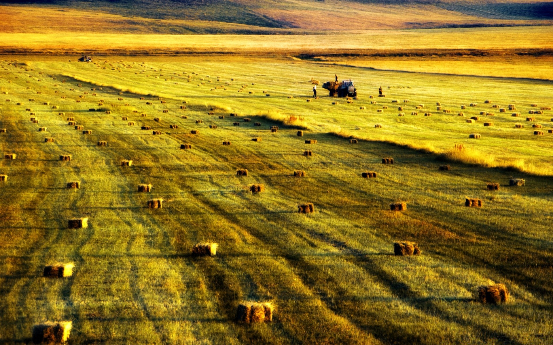 Los trabajadores en el tractor recogen pacas de paja en el campo