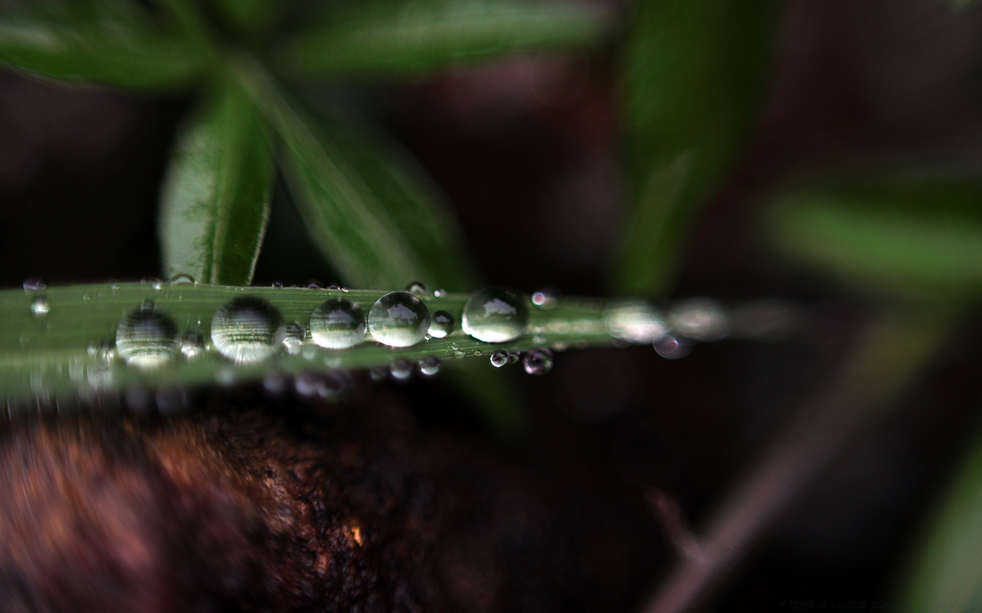 Fotografía macro de una hoja de hierba con una pequeña gota de rocío