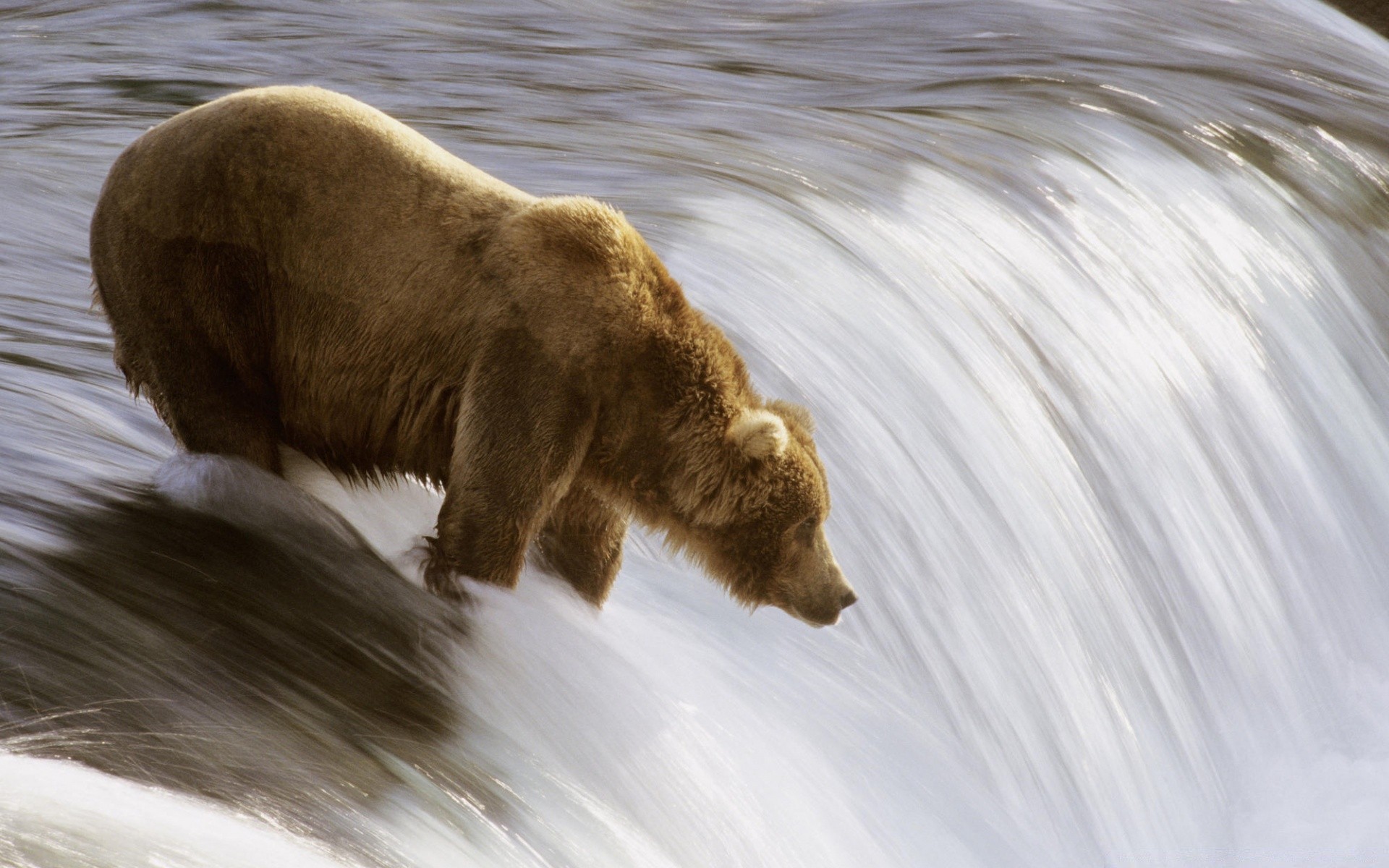 Oso en el fondo de las montañas nevadas y la superficie del aguaOso en el fondo de las montañas nevadas y la superficie del agua
