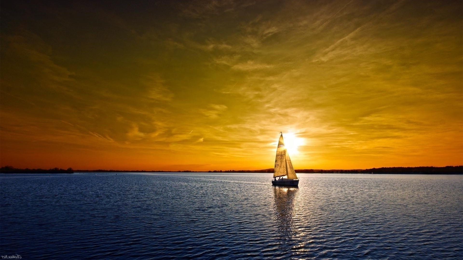 Yate en una superficie de agua tranquila. Puesta de sol, noche