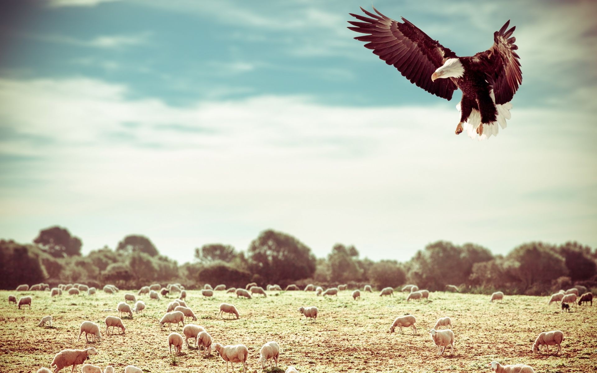 Ave de presa en el cielo sobre un rebaño de ovejas