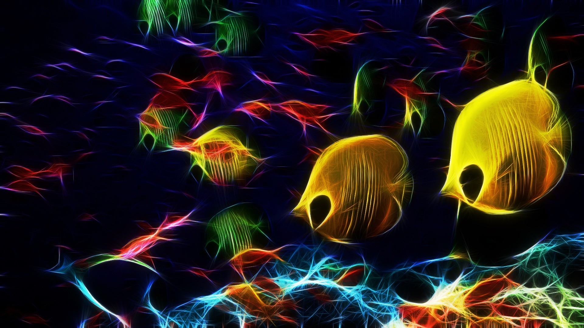 Siluetas de peces iluminadas sobre un fondo oscuroSiluetas de peces iluminadas sobre un fondo oscuro