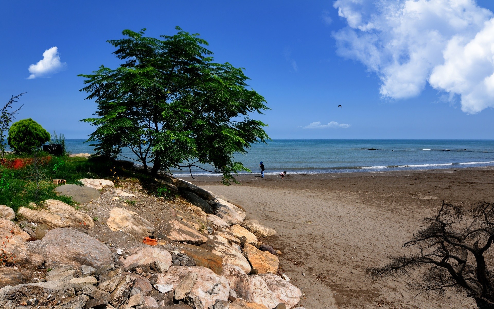 Playa de mar rocoso, cielo al atardecer, niebla ligera sobre el agua