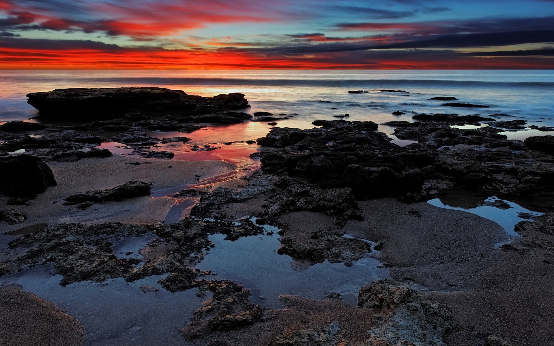 Puesta de sol en la playa salvaje. Lugares inexplorados