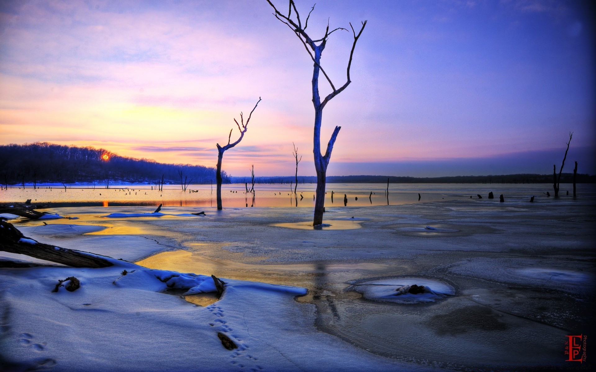 Puesta de sol o amanecer en invierno en la playa y el reflejo del sol en el agua