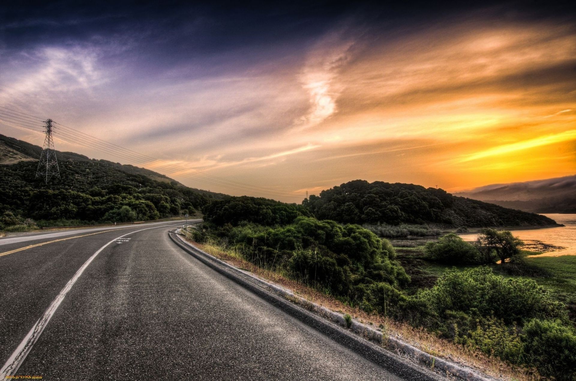 Saliendo de la carretera en la distancia al atardecer entre la vegetación verdeSaliendo de la carretera en la distancia al atardecer entre la vegetación verde