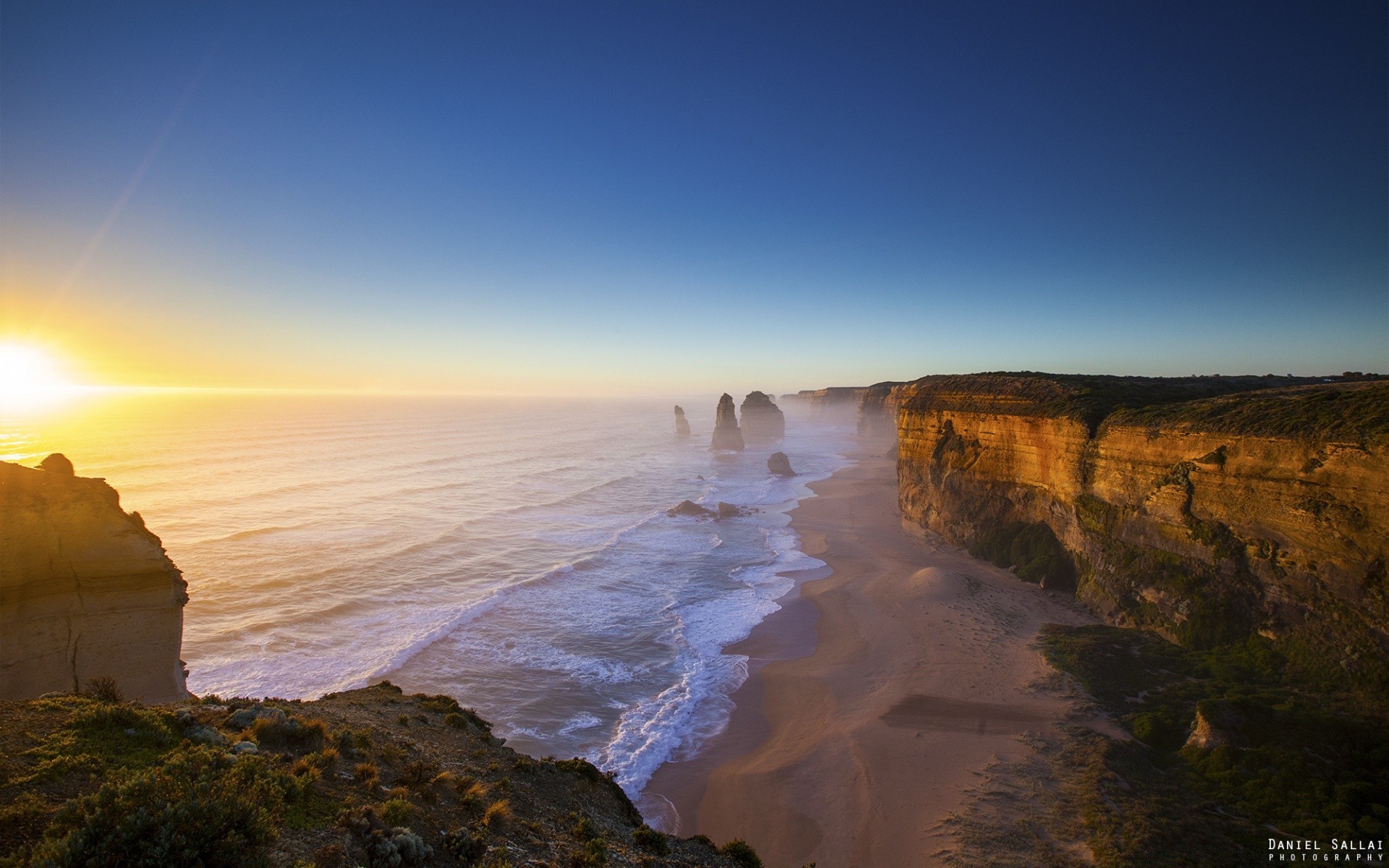 El viajero junto al mar está iluminado por los tenues rayos del sol detrás de la montaña
