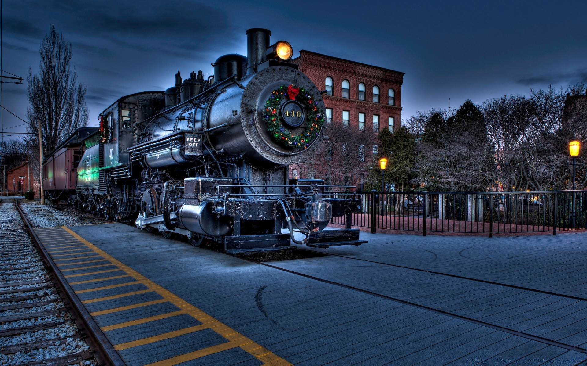 Paisaje de un ferrocarril con un puente de madera en el crepúsculo