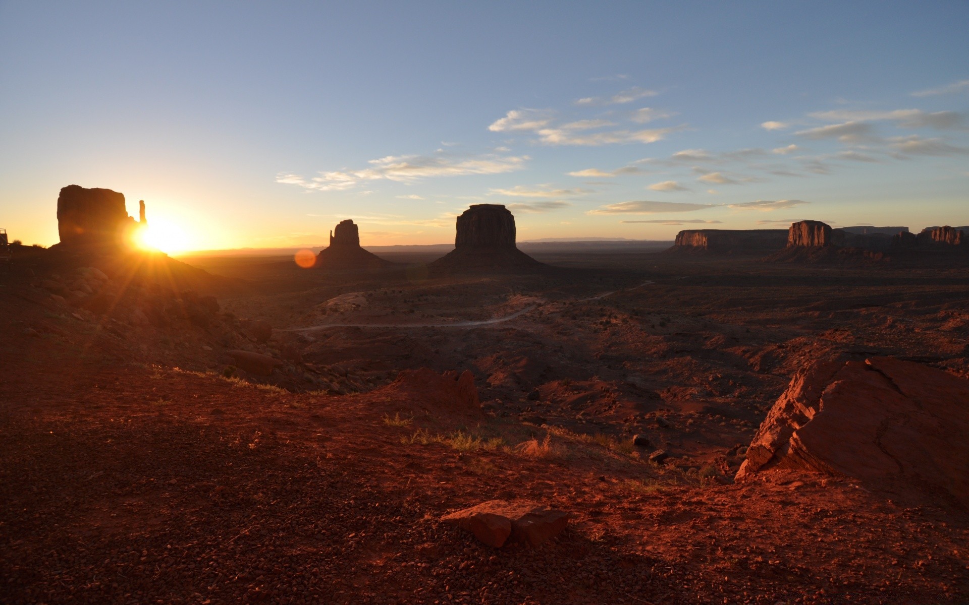 Paisaje en América en el desierto, el atardecer y el amanecer se cruzan al mismo tiempo
