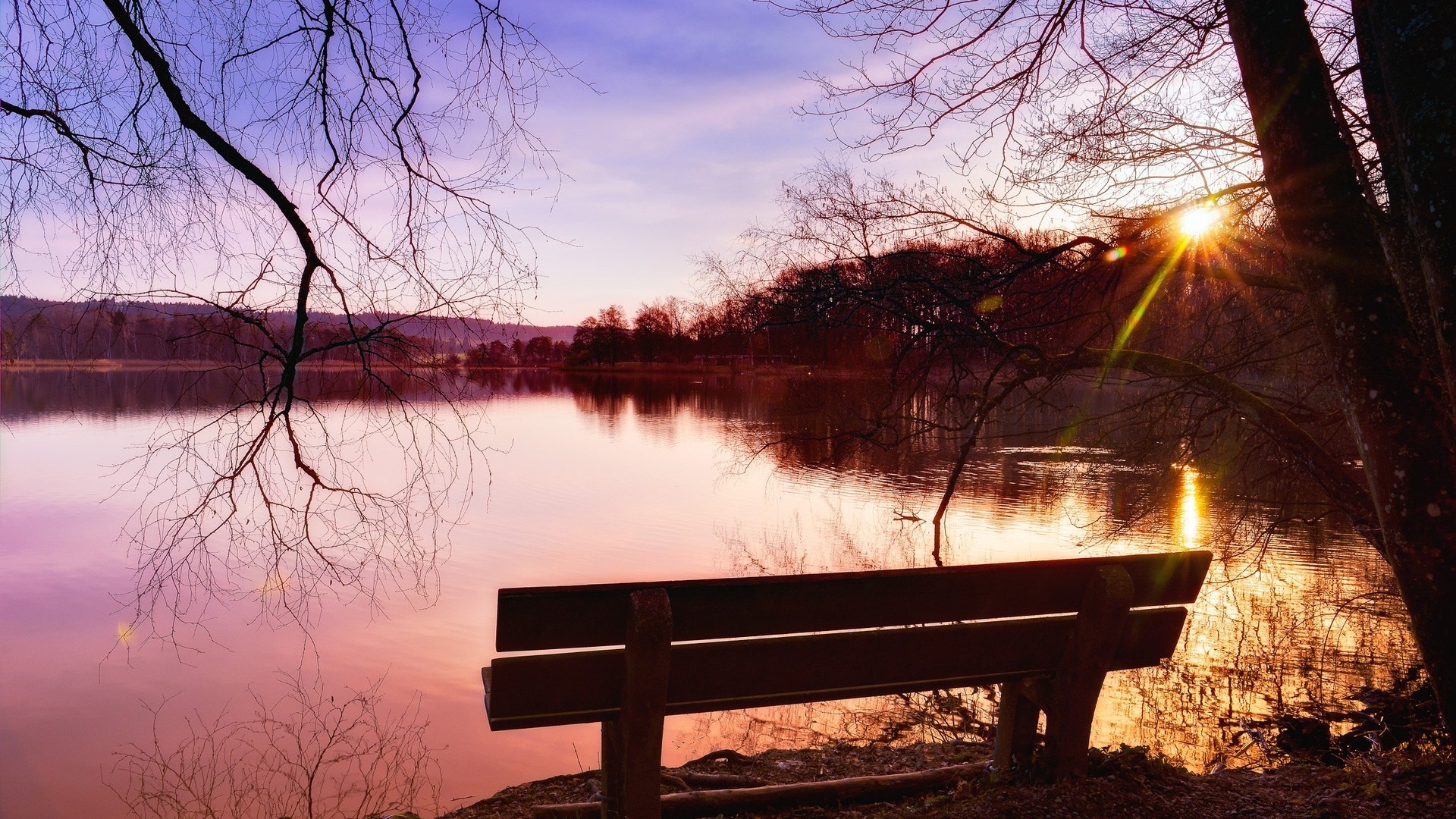 Amanecer de otoño con vistas a un lago pantanoso y una ciudad en la distanciaAmanecer de otoño con vistas a un lago pantanoso y una ciudad en la distancia