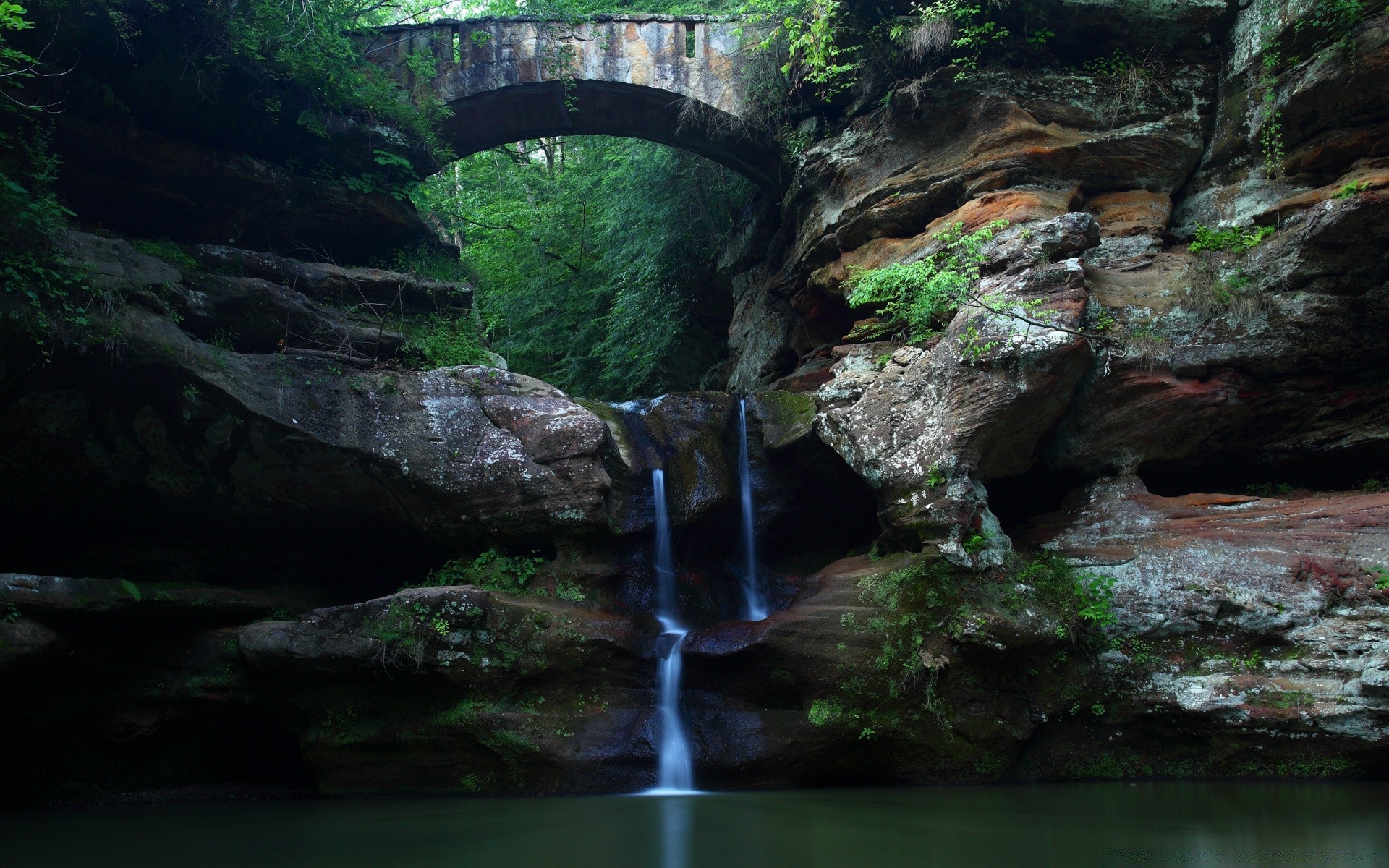 Cascada en la selva tropical y rocas cubiertas de musgo