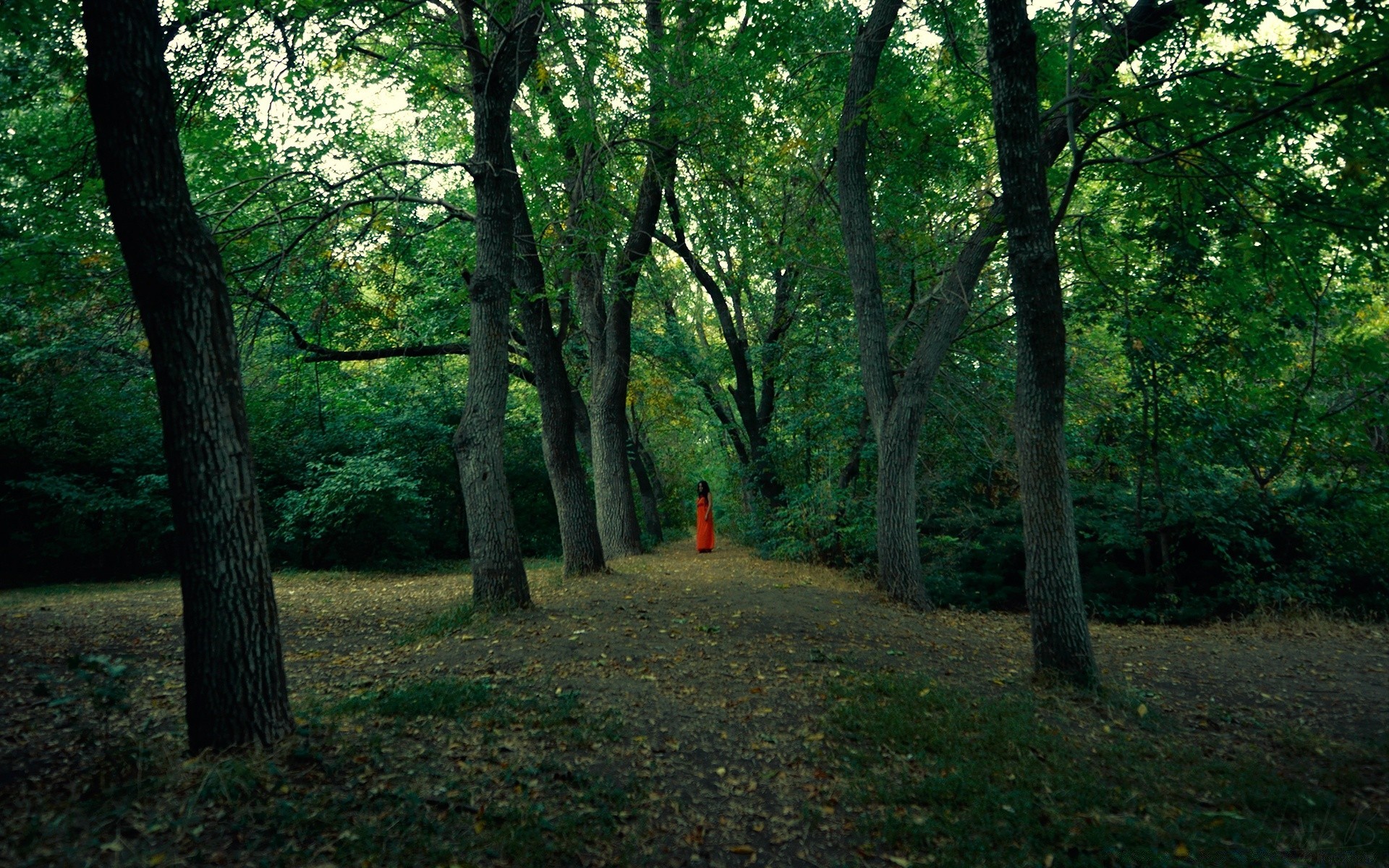 Una joven con un vestido blanco reza sola antes de ser crucificada en un claro del bosque