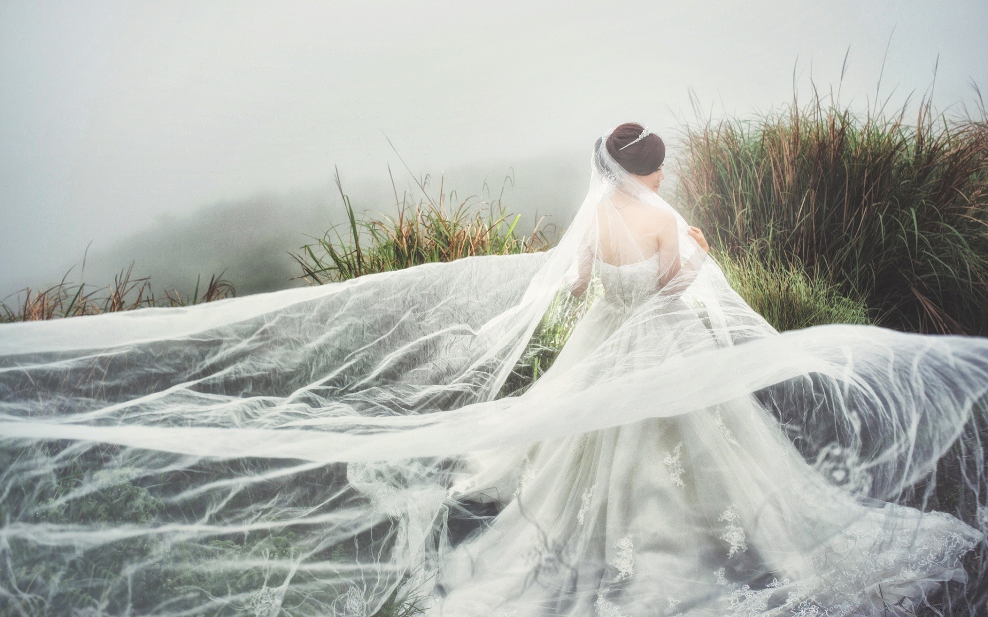 Chica de atrás en un vestido de novia en la naturalezaChica de atrás en un vestido de novia en la naturaleza