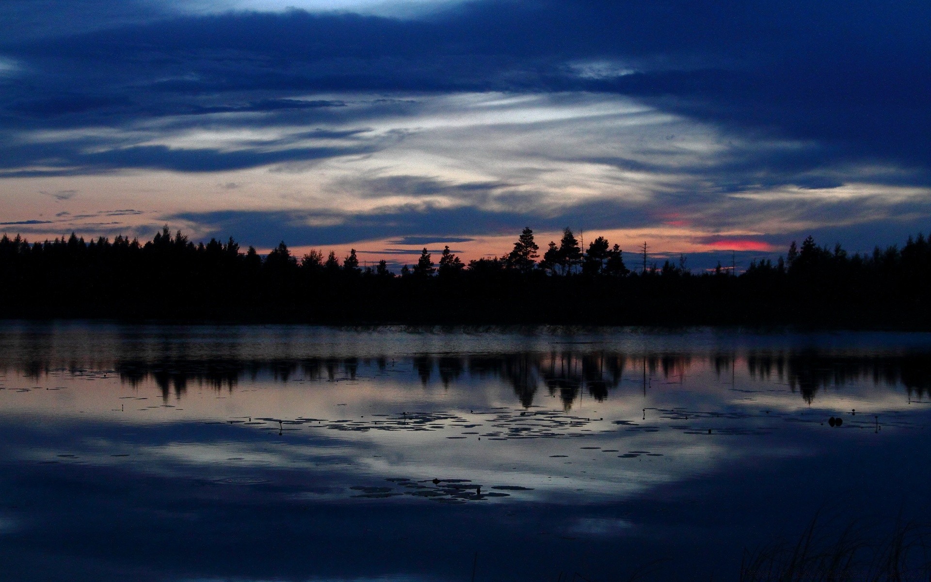 Puesta de sol oscura a orillas de un lago tranquiloPuesta de sol oscura a orillas de un lago tranquilo