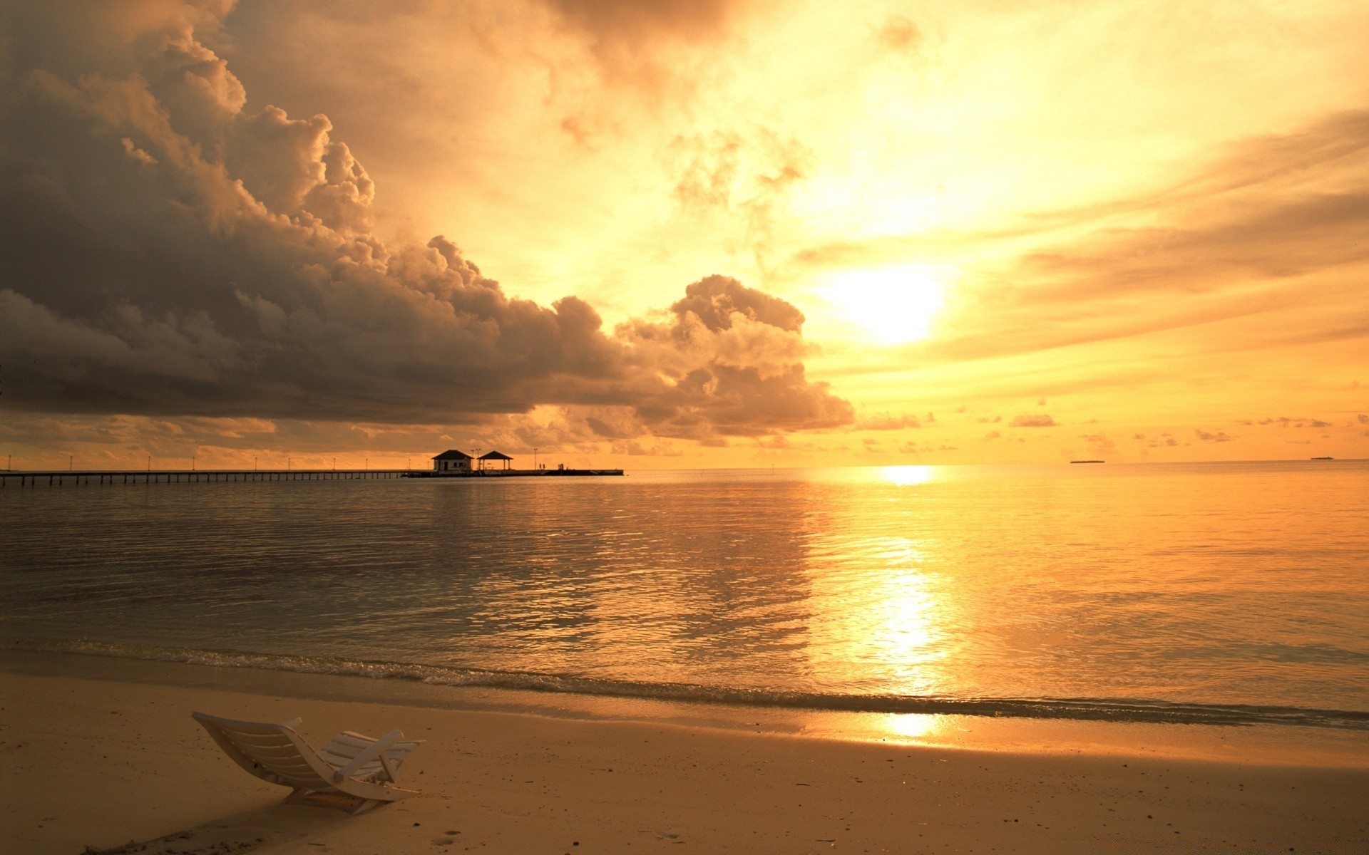 Playa atmosférica con tumbonas y el océano al atardecer