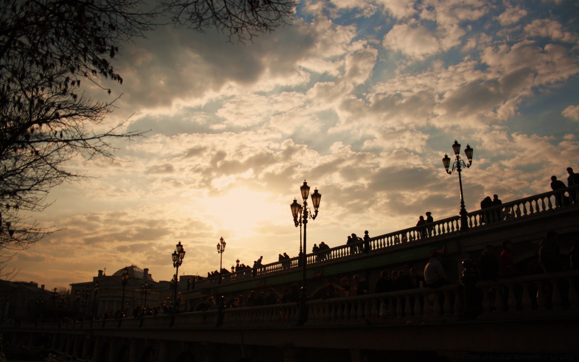 Noche puesta de sol hermoso cielo linternas gente caminando