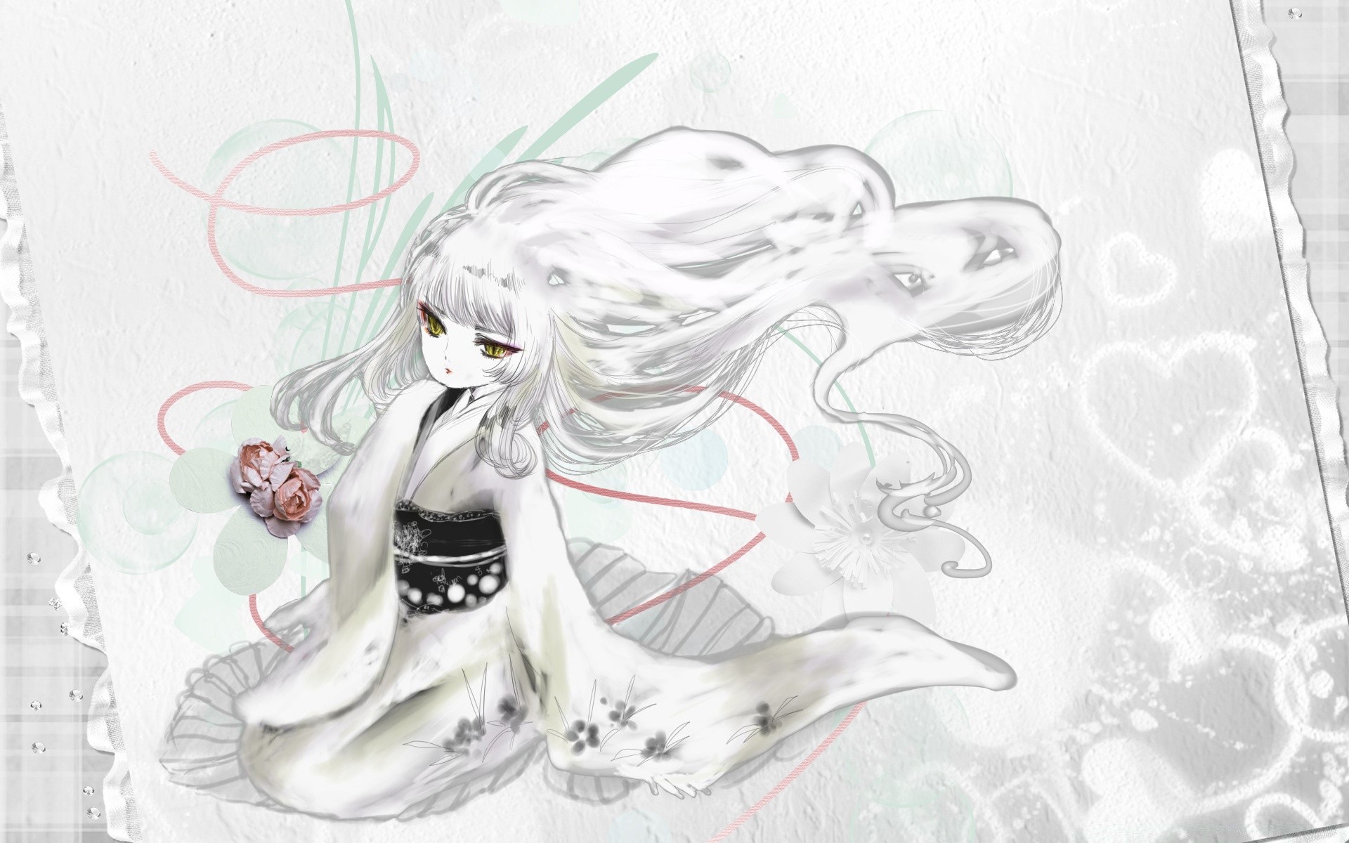 Chica en kimono blanco con el pelo largo y blanco animeChica en kimono blanco con el pelo largo y blanco anime
