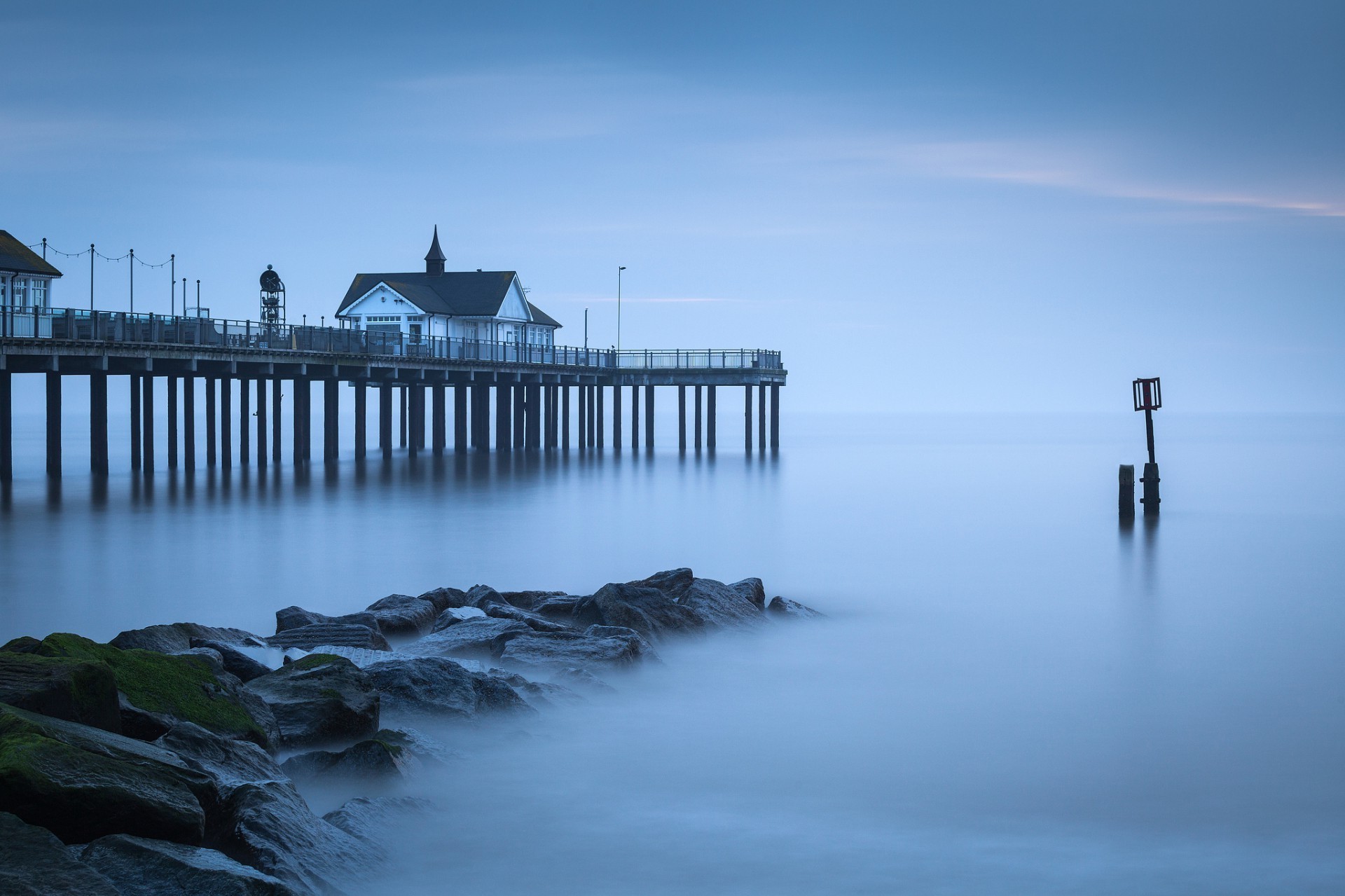 De pie en la playa, el sol brillante brilla tan agradablemente en los ojos