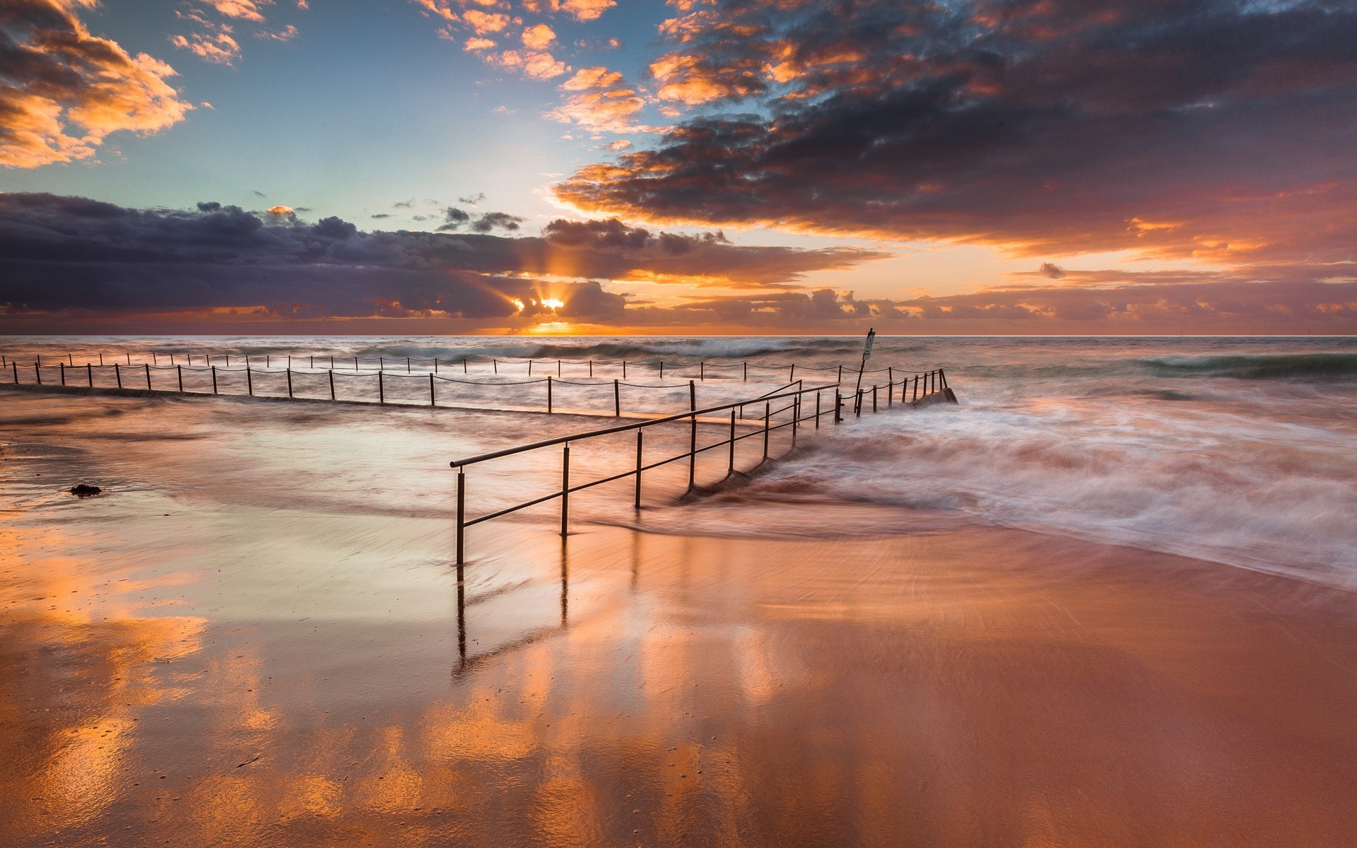 Las olas del mar se estrellan contra la barandilla excavada en la playaLas olas del mar se estrellan contra la barandilla excavada en la playa