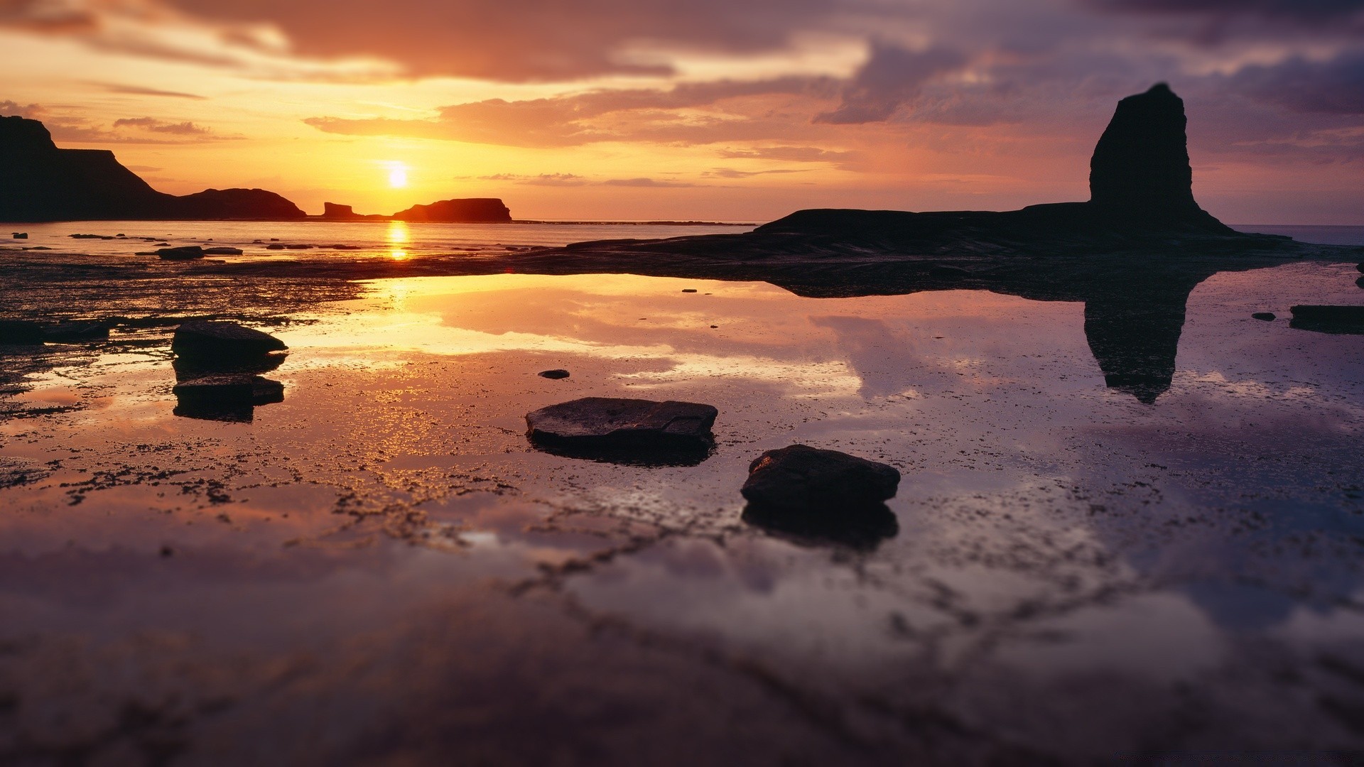 Playa de arena con piedras al atardecer