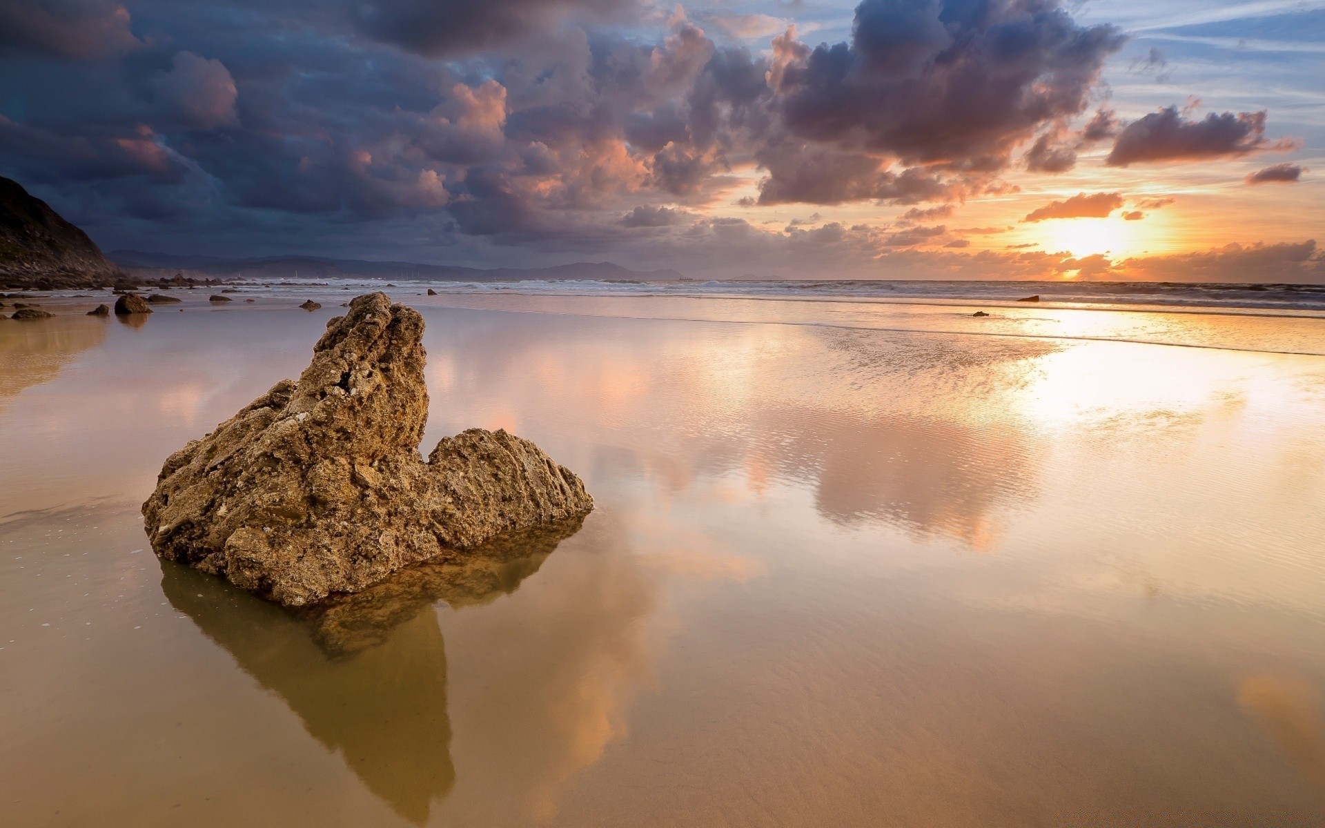 Playa de arena desierta en medio de una brillante puesta de solPlaya de arena desierta en medio de una brillante puesta de sol