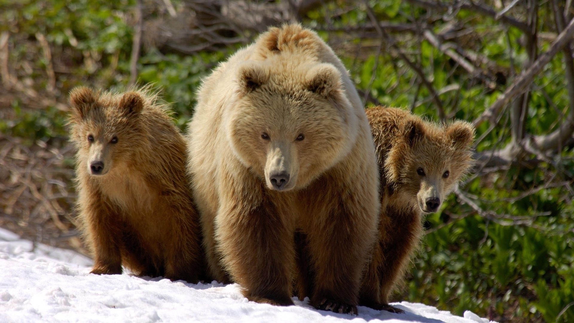 Familia de osos después de hibernar en la nieve