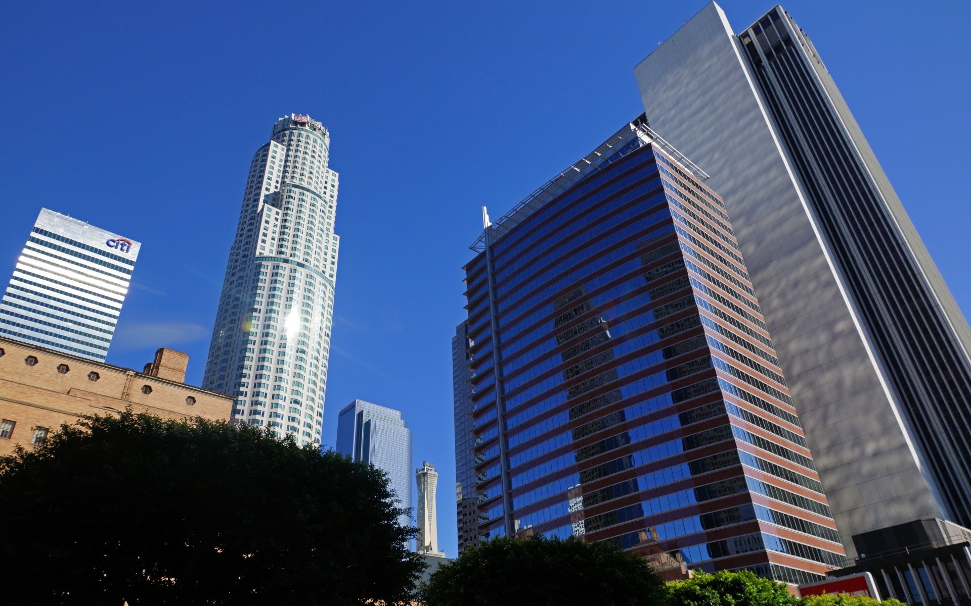 RASCACIELOS DE LA CIUDAD NOCTURNA Y HAZ DE LUZ DE INUNDACIÓN