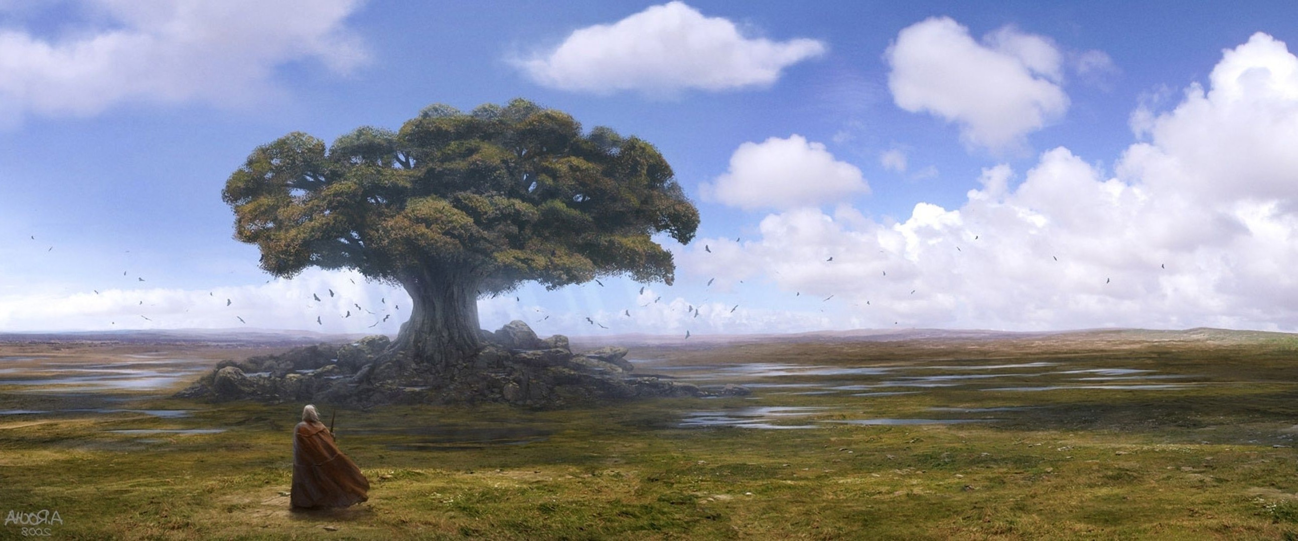 Pintura cielo y árbol en el agua