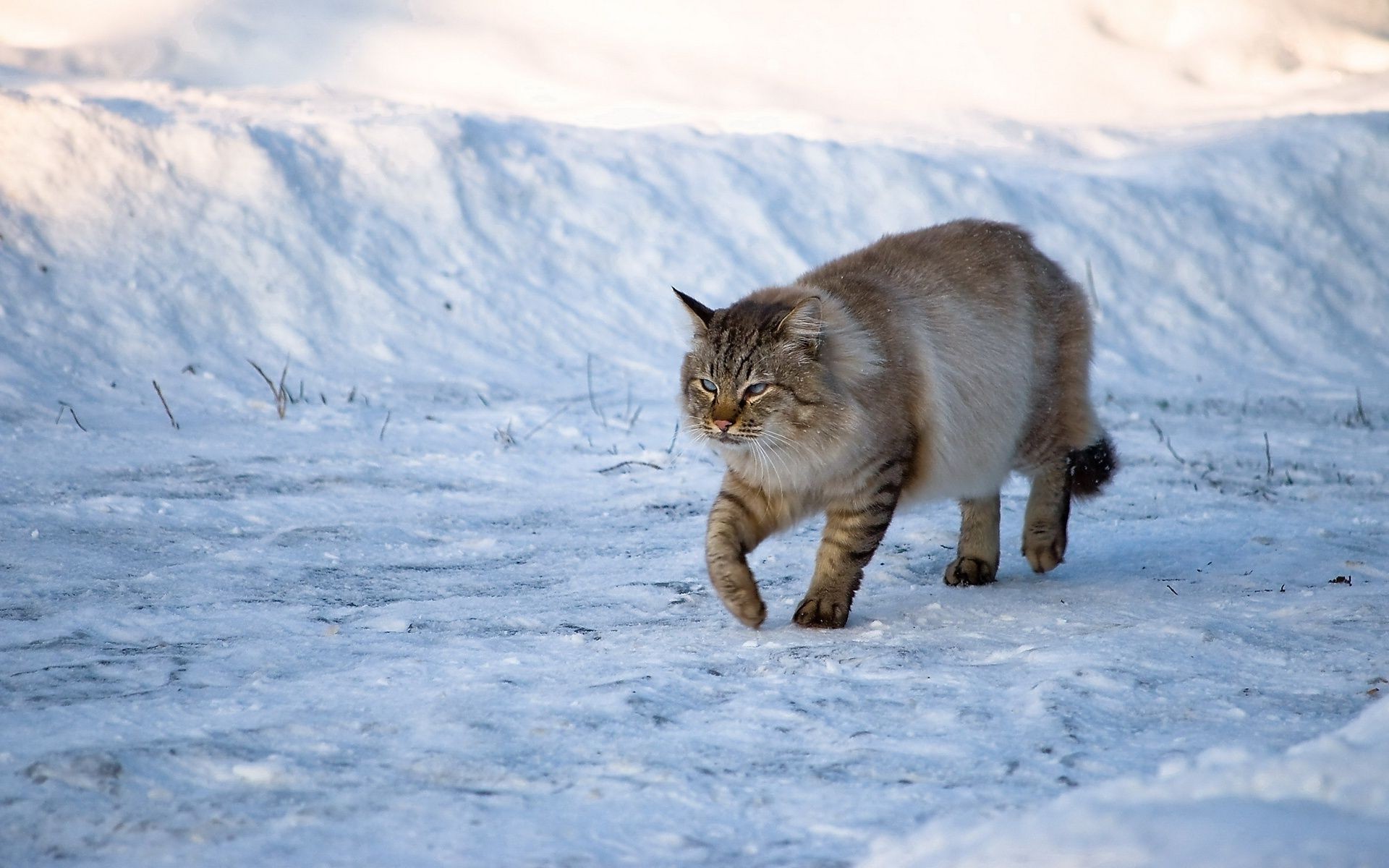 Gato peludo paseando por la nieve