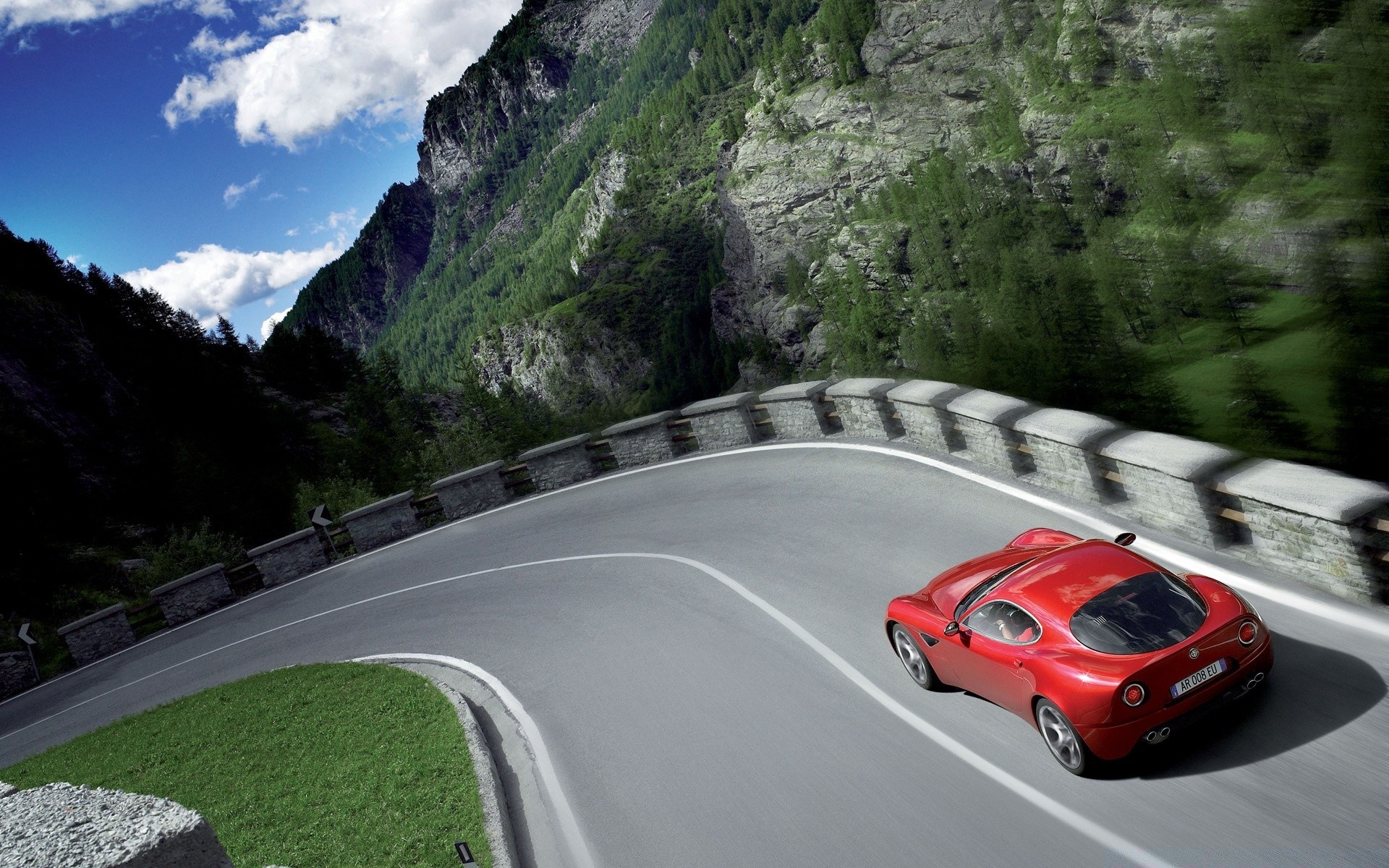 Coche Jaguar conduce a velocidad por carretera de montaña