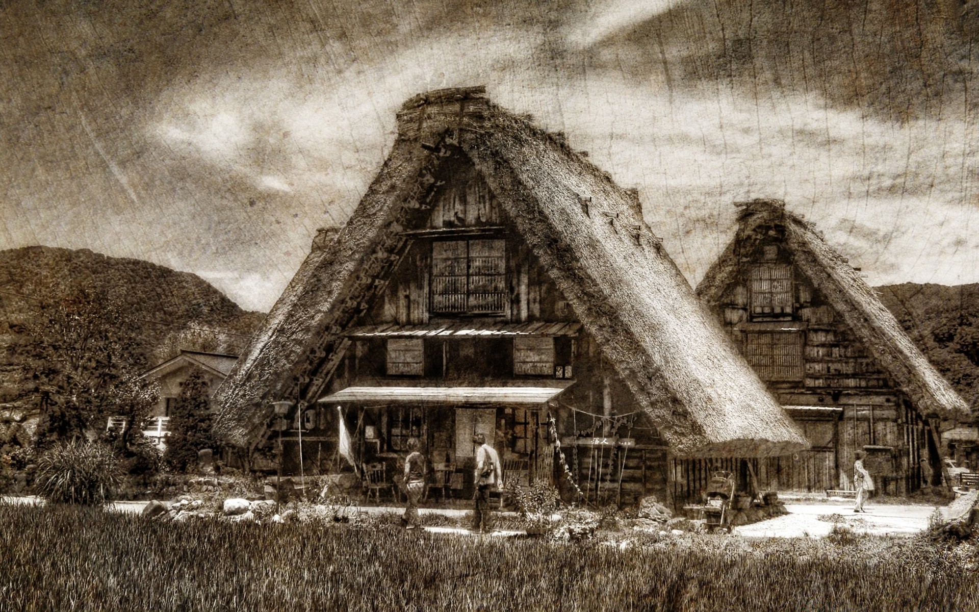 Casa de madera en el campo en medio de un cielo nublado y nocturno