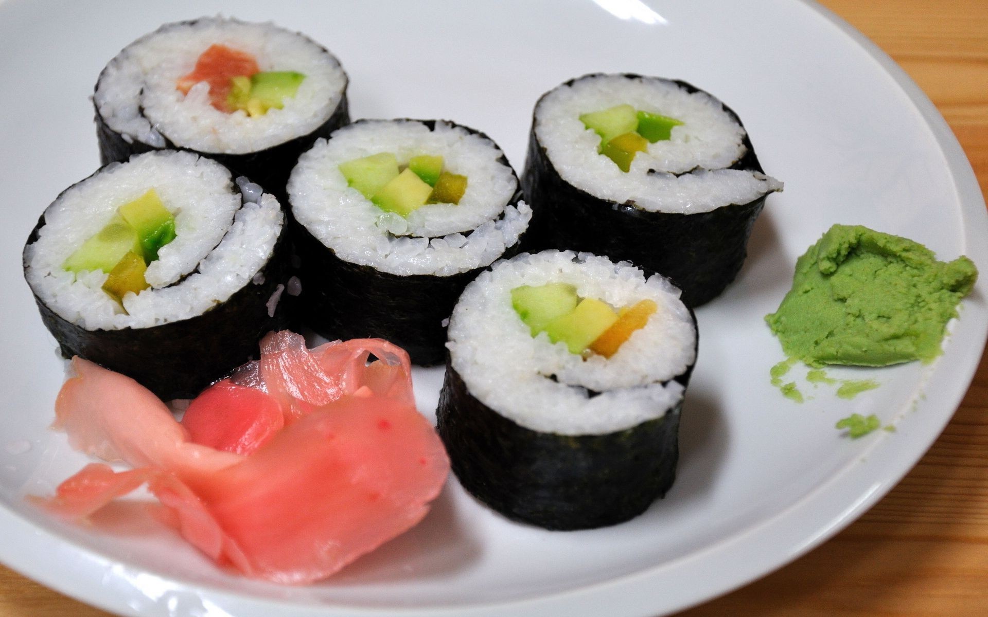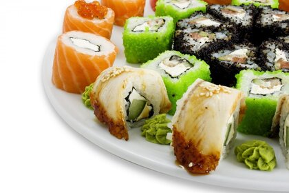 Orden de rollos y sushi. Wassabi en un plato